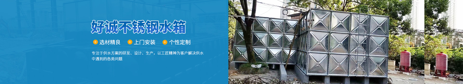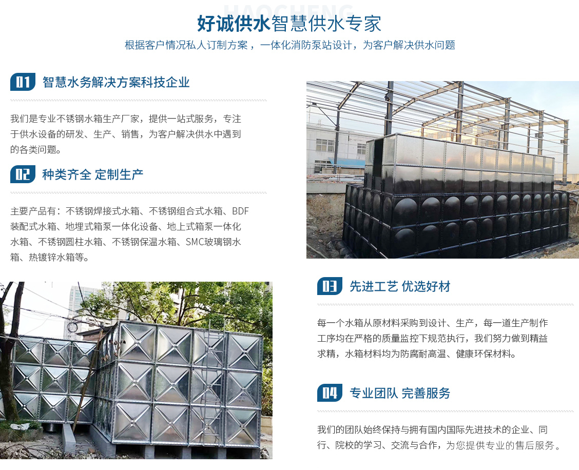 安徽好誠(chéng)供水設(shè)備制造有限公司是一家集設(shè)計(jì)、研發(fā)、制造、銷售、售后為一體的專業(yè)不銹鋼水箱生產(chǎn)廠家,以科技力量立足于社會(huì)。近幾年來致力于供水設(shè)備、水箱的研究與開發(fā)。主要產(chǎn)品有:不銹鋼焊接式水箱、不銹鋼組合式水箱、BDF裝配式水箱、地埋式箱泵一體化設(shè)備、地上式箱泵一體化水箱、不銹鋼圓柱水箱、不銹鋼保溫水箱、SMC玻璃鋼水箱、熱鍍鋅水箱。對(duì)于傳統(tǒng)混凝土水箱的改造(即不銹鋼內(nèi)貼水箱),老舊水箱的拆除、更換、...